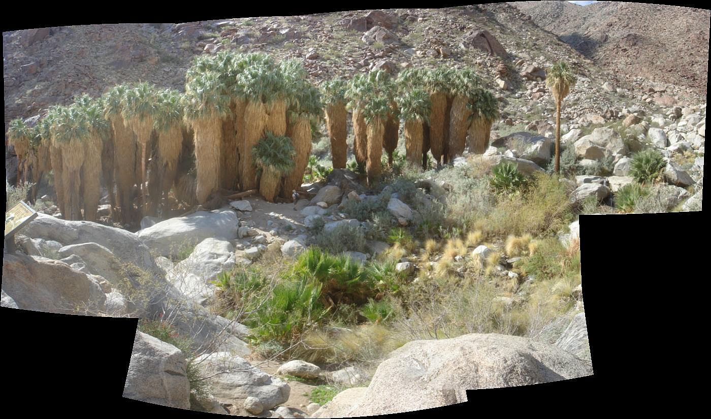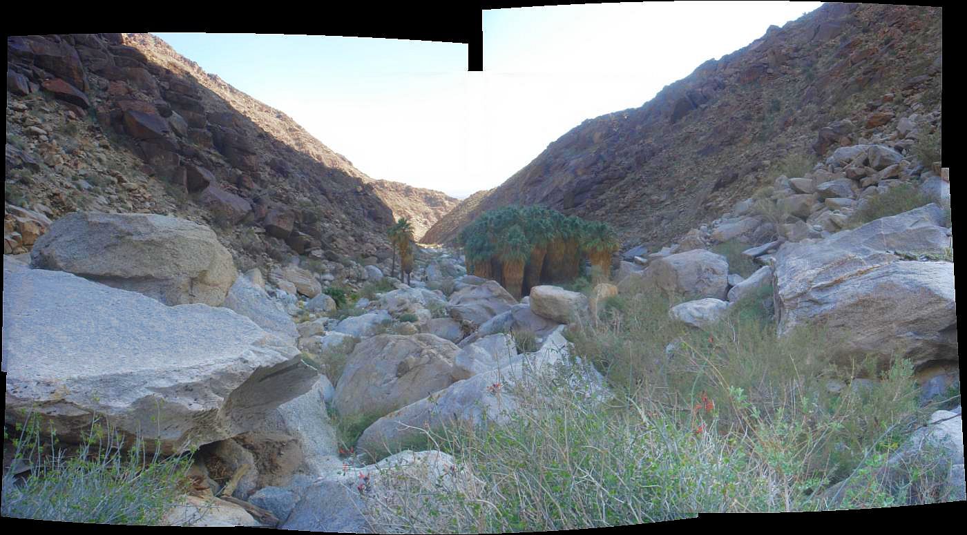 Panorama of five pictures taken on 31 January 2010 from just above the first palm grove looking down to the mouth of the Canyon (larger version). These palm trees are the remnants of a much larger grove prior to the 2004 flash flood that took out a large number of the palm trees here. See picture of ~five year old palm trees that are regenerating the former grove.
