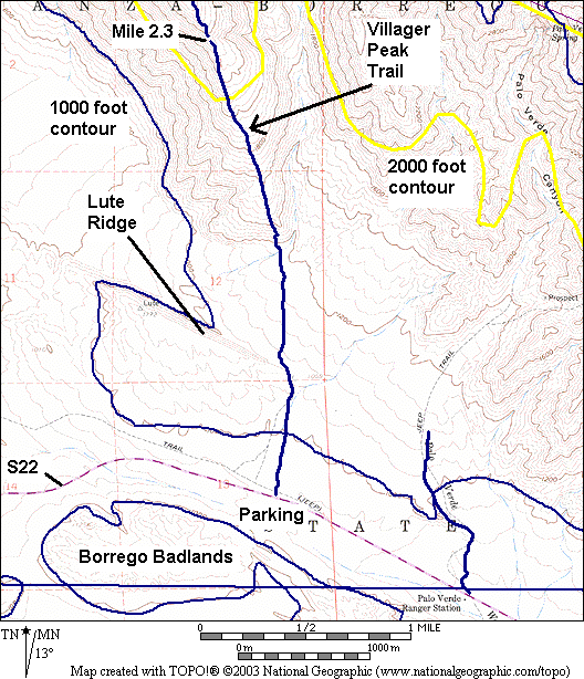 Introduction The Villager Peak Trail climbs a north-south ridgeline of the Santa Rosa Mountains that is directly north of the Borrego Badlands and directly east of Clark Dry Lake. Even the lowermost portion of that ridgeline gives excellent views of the Borrego Valley and surrounding mountains, especially of the Borrego Badlands, with distant views into Mexico.