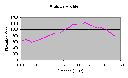 The mileages below are accurate to ~0.1 mile, but are quoted to 0.01 mile in order to preserve the relative accuracy between points. Elevations are accurate to ~5', interpolating between 20' contours.