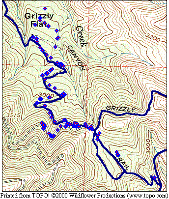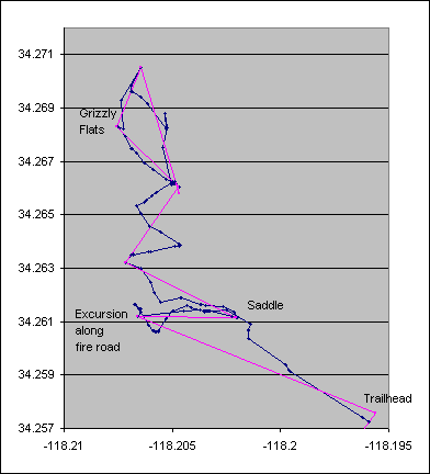 Here is an example of the accuracy degradation for a Grizzly Flats hike in the San Gabriel Mountains. I used the Etrex in normal mode to record a 100 mile journey from my home in San Diego County to the Upper Dark Canyon Trailhead at mile marker 30.02 on the Angeles Crest Highway. I then used the Etrex in battery save mode to record the hike. (Normal mode is necessary to obtain accurate tracks for car travel, but battery save mode is sufficient for low-speed travel.) In the hike, we traveled to the saddle above Grizzly Flats, but then took an excursion along the Fire Road to Mt. Lukens before returning to the saddle and going on to Grizzly Flats.