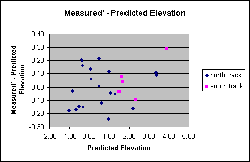 Consider first the azimuthal values. The measured azimuths agree well with the predicted azimuths, as mentioned above. Since most of the data were taken using the northernmost set of rails, the average difference between the observed azimuth and the predicted azimuth for that subset of the data was taken to be the error in orienting the Osborne finder to true North. That average difference was 0.12°. Hence I corrected all measured azimuths (including the southernmost data) by subtracting 0.12° from them, producing the "corrected azimuth angles".
