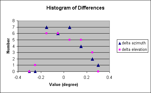 The 0.14° scatter of the delta azimuth angles is much larger than the value of 0.04° expected from the root sum square combination of input coordinate errors (~0.02° for azimuth) and the precision I used in reading the azimuth angles from the Osborne (±0.05°, equivalent to a sigma of 0.03°). (The scatter is defined as one sigma, the average value of the squared delta angles.) This larger scatter is caused by a trend in the residuals seen clearly in the plot. Nearly all are positive for azimuths of 50-220° and nearly all are negative for azimuths of 230-360°. This pattern is not correlated with elevation angle, as seen from examining the peak location plot mentioned earlier. Investigation into the cause of this pattern will be done next.