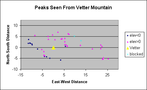 The peaks in the data table that are within 26 miles of Vetter are plotted, with the peaks separately shown for those with positive and negative elevations. (This plot shows the actual elevation angle, not the residual error in it.) A few peaks that are not visible from Vetter (Mt. Williamson and Mt. Hawkins) are also shown to help deduce what foreground peaks block their observation. This plot shows that the nearest peaks to Vetter Mountain are ~five miles away, with mostly higher peaks to the north and east and mostly lower peaks to the south and west.