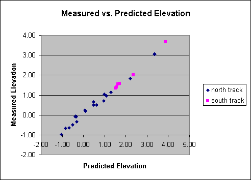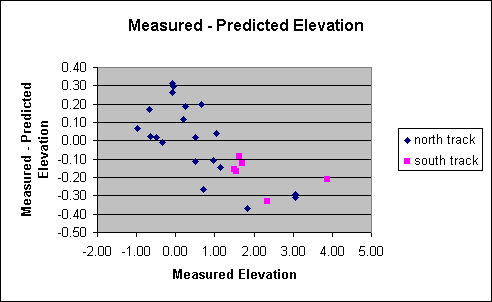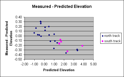 Consider next the elevation angles. A plot of the measured vs. predicted elevation angles reveals that the raw relationship is not as good as it was for the azimuths. Plotting the differences between the observed and predicted elevation angles vs. either the predicted elevation angle or the observed elevation angle immediately reveals that the difference linearly depends on the elevation angle. (The three points at the extreme right makes it look like the relationship becomes more constant at high elevation angles. Although this may be the case, the three points are consistent with a linear trend within the accuracy of the data.)