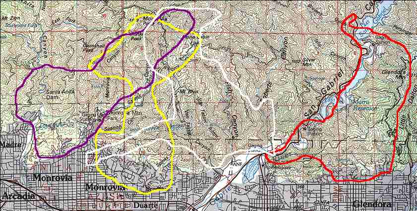 The combined home range is bounded roughly by SR2 on the west and north, Forest Service Road 2N24 on the north, Glendora Mountain Road on the east, and Foothill and Sierra Madre Boulevards on the south.