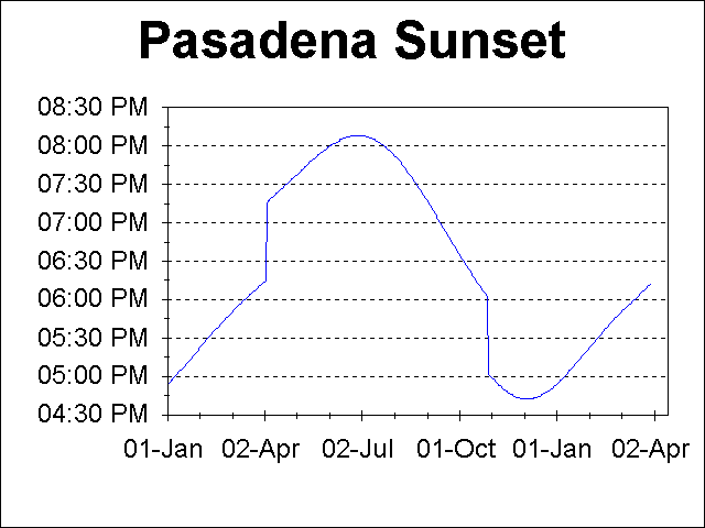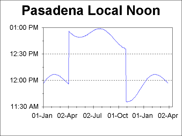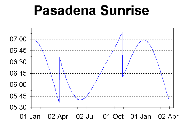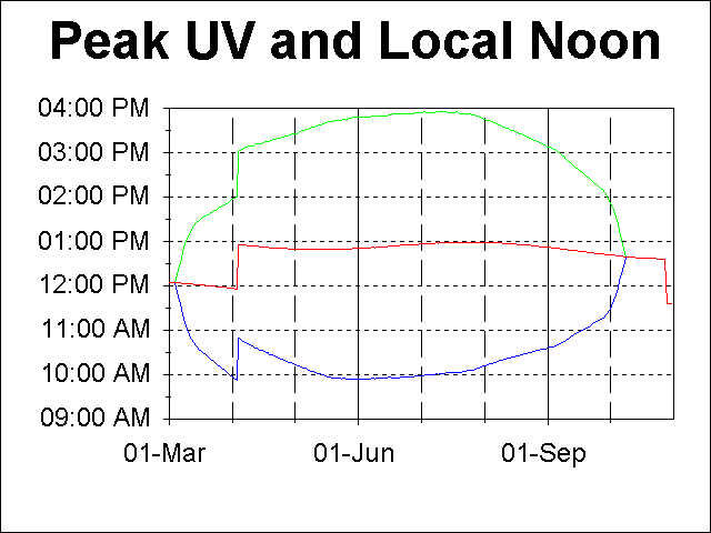 The following plots show the sunrise, local noon, sunset times and times of maximum UV exposure for Pasadena, CA. Daylight time is used when applicable, which accounts for the 1 hour jumps in the times near the beginning of April and the end of October. The sunrise and sunset data were obtained from the US Naval Observatory specifically for the location of Pasadena (W118o 08', N34o 09') from USNO Sunrise/Sunset Computation. The ultraviolet times come from calculations for the latitude of Pasadena using a formula from a Sky & Telescope article for which I embarrassingly do not have the reference handy.