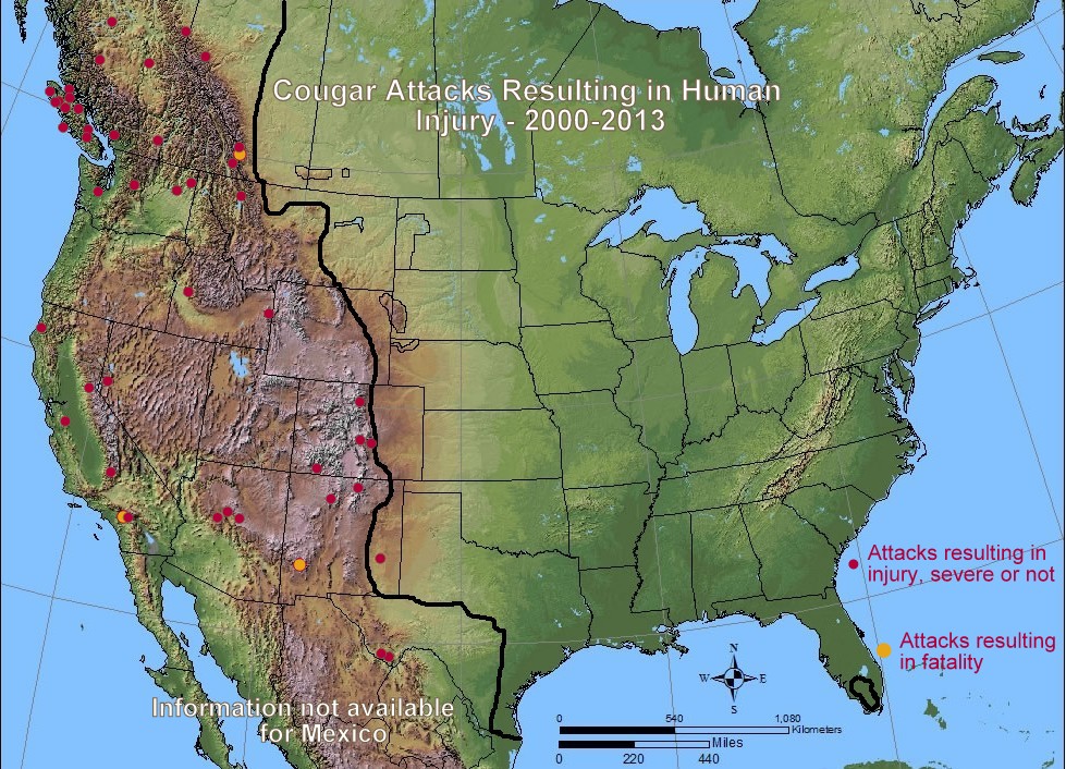 I define an attack as an incident in which a wild cougar inflicts an injury or fatality on a human, anything from a scratch to a fatality. Injuries incurred when someone is scratched or otherwise harmed while rescuing their dog does not count.