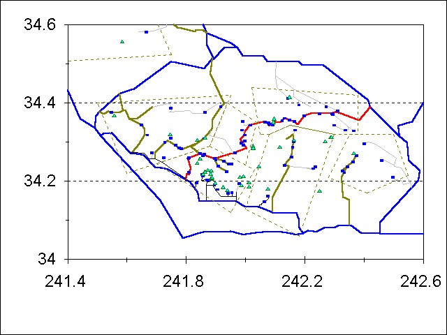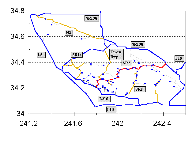 Location of Waterfalls It is no accident that most of the waterfalls are along the front range, since recent uplift of the San Gabriel Mountains relative to the L.A. Basin on the Sierra Madre Fault System has created them. The falls have remained close to those faults in areas with lower rates of water erosion like the small drainages south of Mt. Wilson and Monrovia Peak. Other falls have "moved upstream" in areas with higher rates of water erosion, like along the Arroyo Seco, Big Tujunga Creek and the San Gabriel River. See unlabeled map, with the waterfalls marked by blue-green triangles. If you need help interpreting that map, see labeled map and for further help the map tutorial.