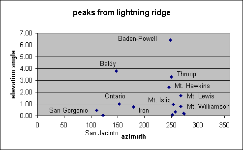 At the summit, on the north side of the road, is a large trailhead parking lot for the Pacific Crest Trail complete with restrooms. Also on the north side is a nature trail circling Lightning Ridge with an incredible display of wildflowers for much of the year. To the southwest is Inspiration Point, a not-to-be-missed vista overlooking the East Fork of the San Gabriel River, Mt. Baldy and Mt. Baden-Powell. (See calculated elevation angles and azimuthal angles to visible features from Lightning Ridge.) To the southeast is an electronic site and the Blue Ridge Road, the access for hiking Wright / Pine / Dawson / Baldy Mtns., the northern Devil's Backbone Trail.