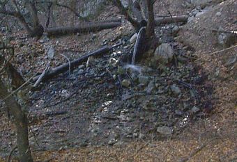 ![]() Figure 5. The spring emerging from the rock. | On the other side, the water issues out of a cave going through the solid rock layer (Figure 5). Then the stream flows through and over rocks to a mushy area for a vertical distance of 10' and horizontal distance of about 15', and soon merges with a larger stream coming from the north. |