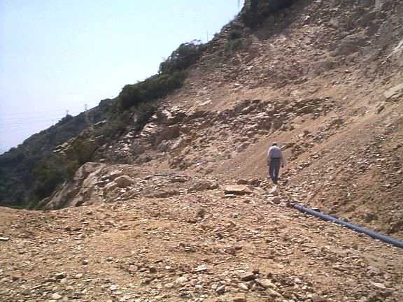 - View from the edge of the cut, showing 6' Paul Ayers and the pipe that caused all the trouble.