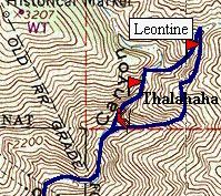 The route is difficult to explain; see the topo map showing the location of Leontine and Thalehaha Falls for orientation. (The topo map was supplied by Troy Sette from Topo! © 1997 Wildflower Productions. The credit no longer fit on the map when the map was made smaller in size, and hence is given here.)
