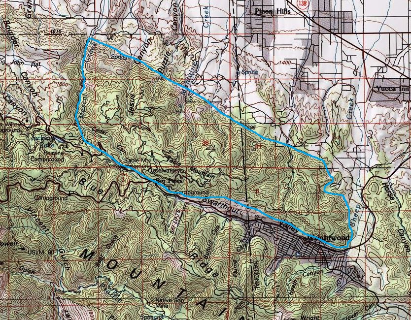 Table Mountain is in the extreme northeast portion of the San Gabriel Mountains. We define the Table Mountain floristic area extending from Mescal Creek on the west to Sheep Creek on the east, north of the San Andreas Fault in the Wrightwood / Swarthout Valley, and south of the alluvial deposits in the Mojave Desert; see topo map.
