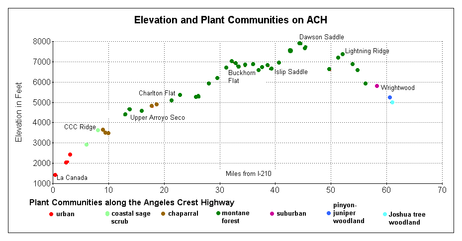 | 3.1 | 27.40 | 2400 | Angeles Crest Station, on left | all | coastal sage scrub | +mountain mahogany, deerweed |