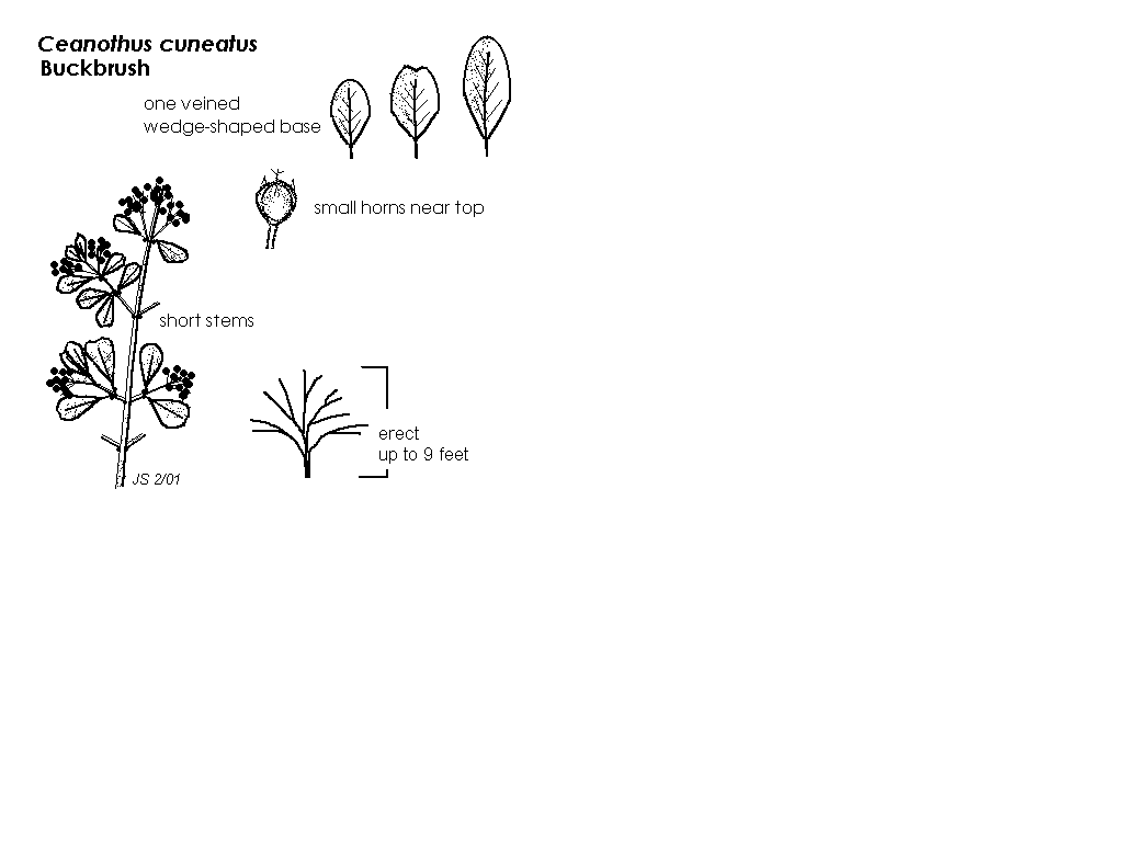 - Common name: buck brush, buckbrush or wedgeleaf ceanothus; cuneatus=wedge-shaped like cunieform writing