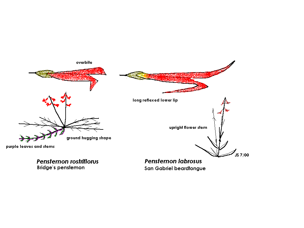 Penstemons in the San Gabriel Mountains have tubular flowers, colored either scarlet or a shade of purple or blue, and opposite (paired) leaves. The flowers have five petals usually divided into two lips--the upper one of two lobed (rounded) petals and the lower of three cleft (cut) petals. The name, Penstemon, comes from "five stamens". Sometimes one of them is hairy or bearded giving rise to the common name for some species, Beardtongue. Introduction