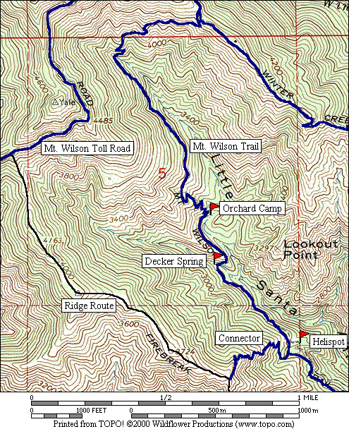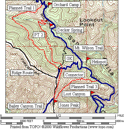 Mac talked to Pete and Charley, two people maintaining the lower part of the Mt. Wilson Trail, on December 15, 2001, who told him that the planned longer connector trail would require chiseling rock in the Decker Spring drainage, and thus won't be built for quite some time. They also said that this currently-existing connector trail was not built by their group.