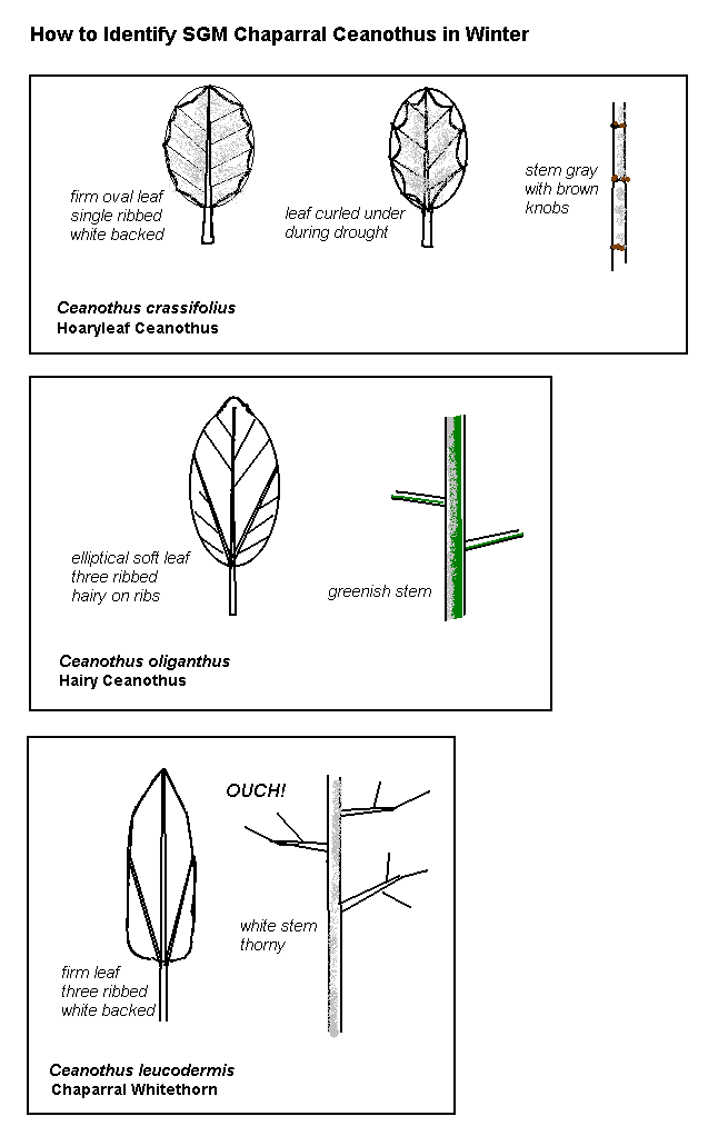 - The branches that you either duck under or push out of the way are from the whitethorn ceanothus. Hiking the trail will allow you to achieve an intimate familiarity with this species. When one of the thorns catches you, you can immediately recognize the "whitethorns". Furthermore, the description of hard chaparral as vegetation that can only be traversed by crawling through it will resonate strongly as you are ducking as low as you can go in some places, hoping that the thorns won't pierce your hat.