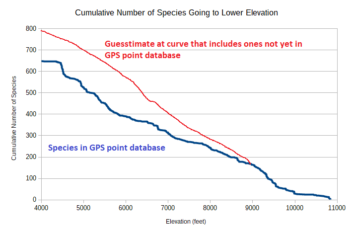 Fig. 2 shows the cumulative number of species as one goes from the top of San Jacinto Peak at 10,800 feet to lower elevation, both as observed in the GPS point database and with an estimated curve that includes the 141 taxa that do not yet have digitized GPS points.