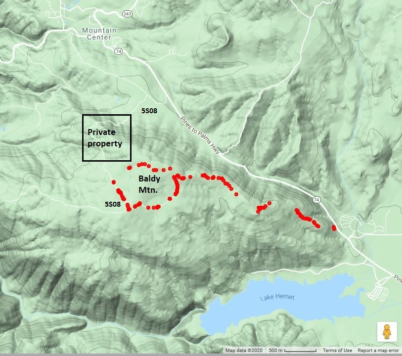 Fig. 1. Map showing the Baldy Mountain area, southeast of Mountain Center and northwest of Lake Hemet, along with places where Tom has recorded species in his two surveys. Jordan's surveys have been concentrated in the area on top of Baldy Mountain, roughly shown by the circle of Tom's GPS points there. The gated Forest Service access road to the top (5S08) from SR74 traverses private property; permission is needed to use that section of the road even by foot.Introduction