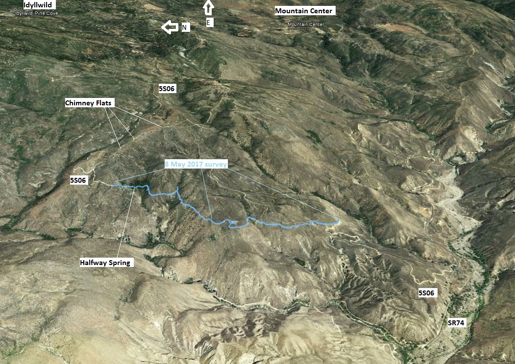 See also topo map with the 8 May 2017 survey shown.Fig. 2. Google Earth View (north is to left; east is up) showing the location of the Old Control Road (Forest Service Road 5S06), with the 8 May 2017 survey path shown in light blue. Click on the map to get a larger version.