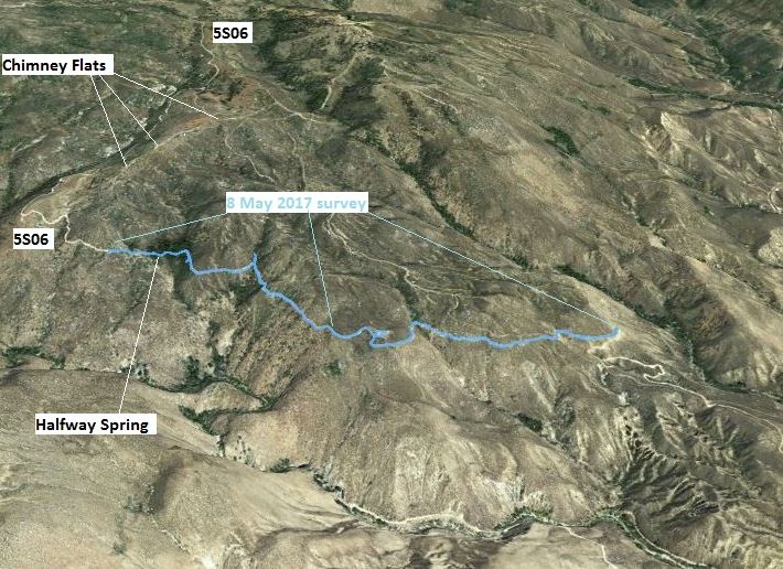 - a survey on foot on 8 May 2017 by Tom Chester and Nancy Accola, from mile 1.35 to mile 3.00, which is just above Halfway Spring at mile 2.9;