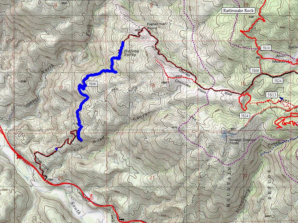 The area Above Halfway Spring is from mile 3.02 (elevation 3850 feet) to 4.89 (elevation 4700 feet), ending at the upper end of Chimney Flats where the road makes a turn to the northeast to head to Alvin Meadows.