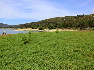 Most of the species in the flora are unrelated to the Lake, growing above the shoreline of the Lake and in the streams. However, it is of much interest to note the shoreline and aquatic species found in the Lake, since every one of them has had to be introduced into those areas since the Lake was filled 126 years ago. Many of those species presumably have arrived by birds or boats from areas outside of San Jacinto Mountain, since there are no permanent lakes here. We have only one ephemeral lake, Hidden Lake in Long Valley, which is at a much higher elevation, and has few species in common with Lake Hemet.
