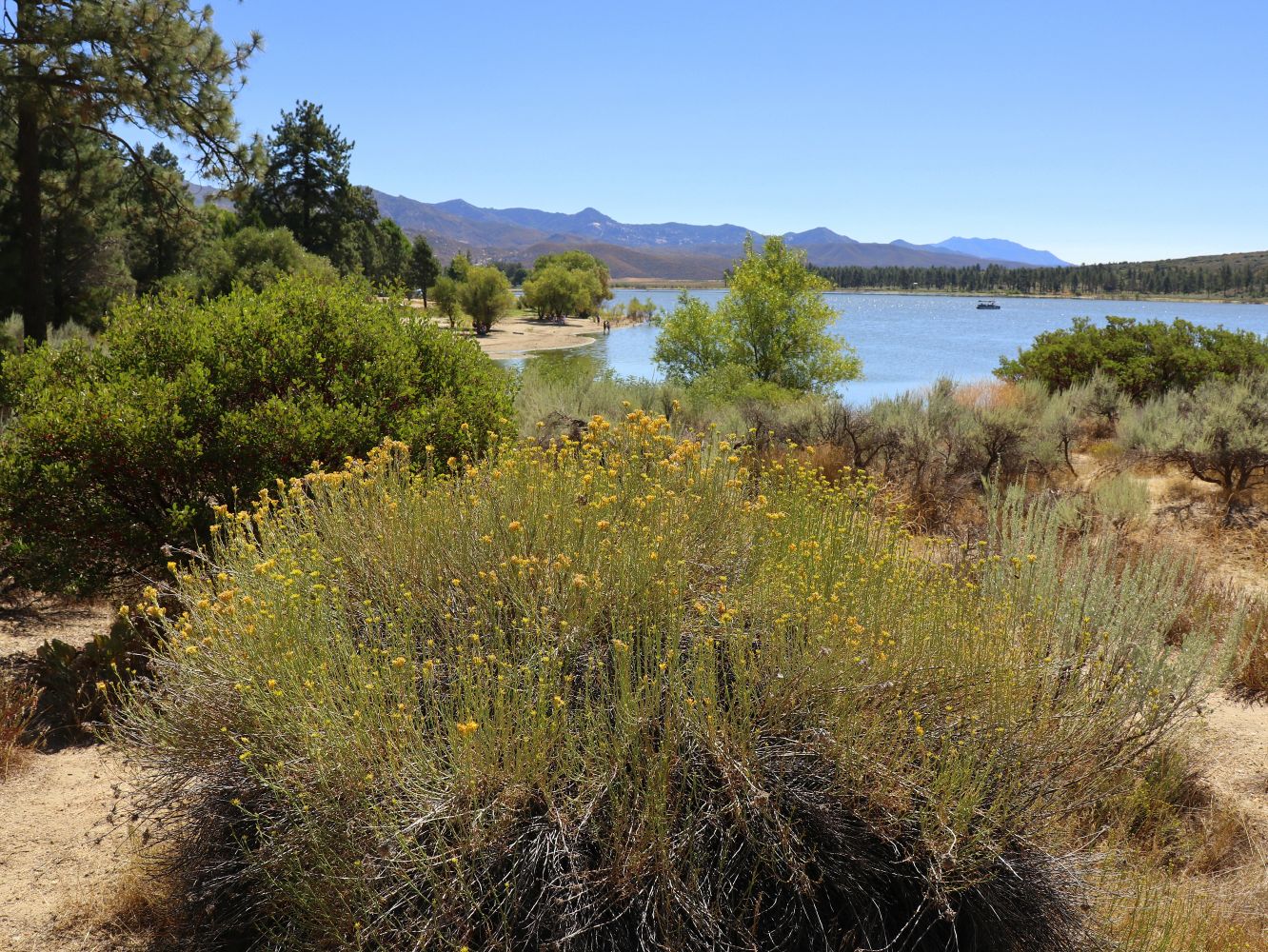 Bottom: View across Lake Hemet from its northwest end, looking east / southeast. Ericameria nauseosa var. oreophila, threadleaf common rabbitbrush, is in the foreground. The Desert Divide is the main skyline ridge, with the more distant Santa Rosa Mountains seen at the right where the Desert Divide ends near SR74. Note the people along the shoreline for scale.
