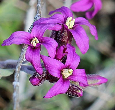 All photographs © Bruce Watts; all rights reserved. Click on the pictures for larger versions.The Quinn Flat / Kenworthy Area is a rich and interesting area for plants despite being a basically-flat area with an elevation range of only 150 feet, from 4450 to 4600 feet, in most of its area, with a small area extending 200 feet higher in elevation, to 4800 feet. Its diversity is due primarily to the low hills of the Bautista Formation, which provide slopes facing all points of the compass, as well as old remnant surfaces that host rare plants such as Boechera johnstonii, Johnston's rock cress; and Penstemon californicus, California penstemon.