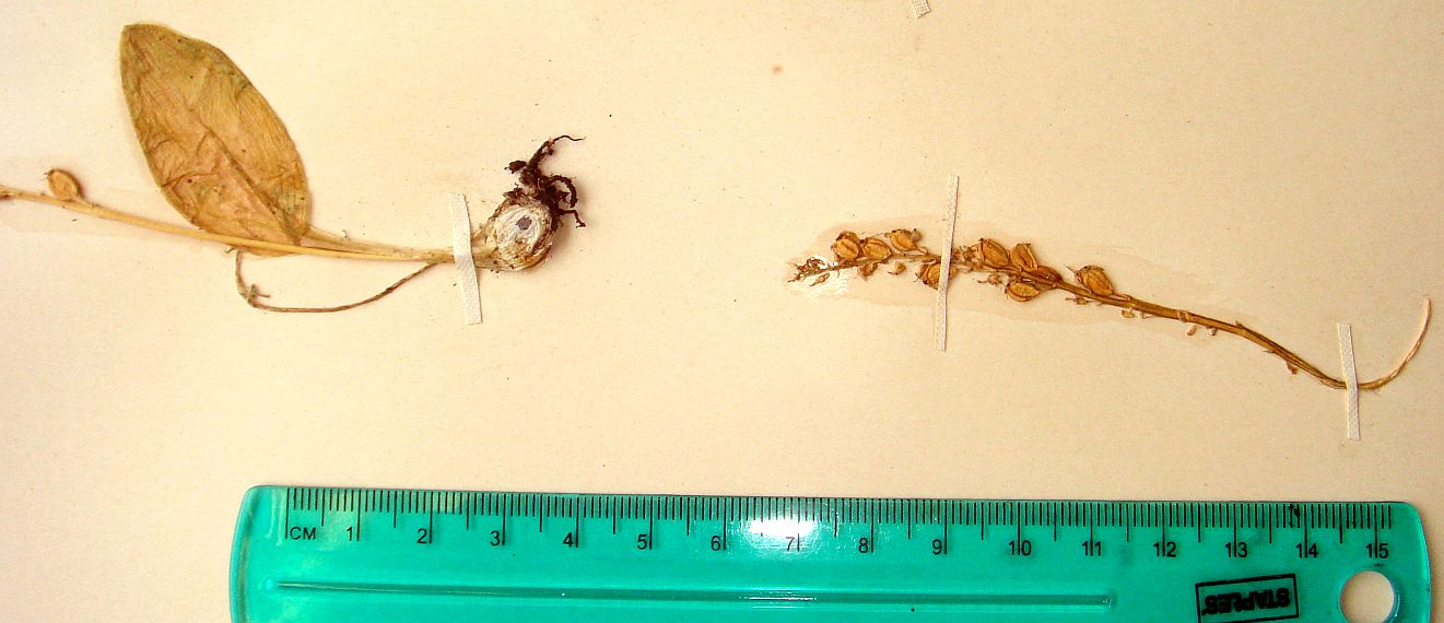 - Malaxis monophyllos ssp. brachypoda, adder's-mouth, was vouchered by Munz, #6366, on 5 September 1922, from Meadow north of Tahquitz Valley, 7300 feet. In Bulletin of the Southern California Academy of Sciences, Vol. 22, Part I, p. 7, Munz stated that it was found growing on small hummocks in wet meadows on the south fork of the Santa Ana River in the San Bernardino Mountains, and in similar situations in Skunk-cabbage Meadow in Tahquitz Valley, San Jacinto Mts. (Munz 6366). (Skunk Cabbage Meadow is at 7900-7940 feet elevation; it is not unusual to find elevations this far off in vouchers.)
