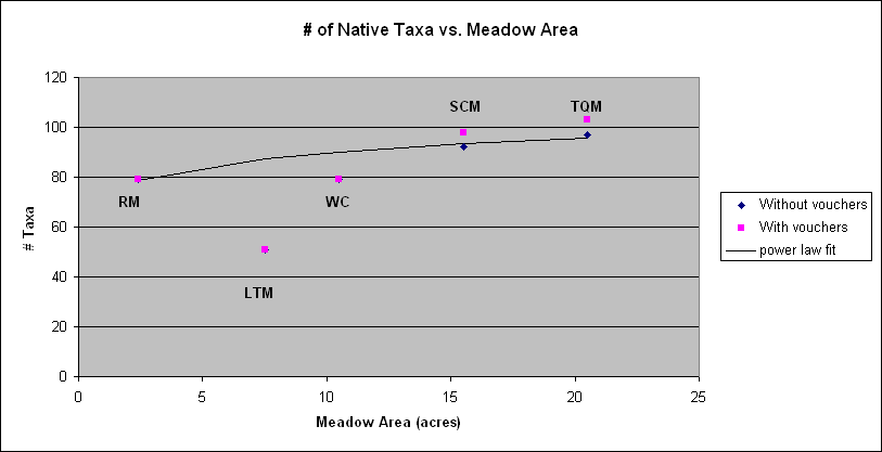 Meadow Area (acres) # Native Taxa Perimeter (miles) Elevation range (feet) Elevation range (m) Tahquitz 20.5 103 1.2 7840-8040 2390-2450 Skunk Cabbage 15.5 98 1.3 7900-7940 2410-2420 Wellman Cienega 10.5 79 0.7 8960-9420 2730-2870 Little Tahquitz 7.5 51 0.5 7960-8080 2425-2460 Reeds 2.4 79 0.3 7680-7720 2430-2355 Figure 1 plots the number of taxa vs. meadow area, both from just our surveys and with the inclusion of vouchered species that we have not observed. We also fit a power law to the data for Tahquitz Meadow, Skunk Cabbage Meadow, and Reeds Meadow, without vouchers, since that is a more uniform data set. We excluded Little Tahquitz Meadow from the fit since the plot shows that it is very depauperate for species. We excluded Wellman Cienega from the fit since it is roughly 1,000 feet higher in elevation, and a number of species are not found at such high elevation. The best-fit exponent for the area was a very low 0.09, reflecting the uniformity of habitat for those three meadows.