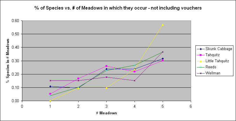 Table 4 gives the breakdown for the number of species found in N total meadows, for the entire meadow checklist, considering just the 134 native species we've observed from any meadow. (The total checklist contains 151 taxa, the 134 native species we've observed; eight vouchered native species we haven't observed; seven non-native species; and the two other entries for Epilobum ciliatum).