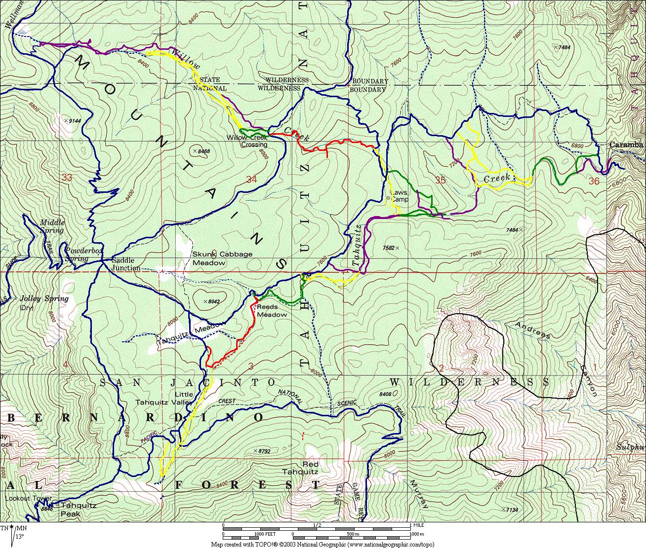 - The east-west Tahquitz Peak / Red Tahquitz Peak, and northeast Red Tahquitz Peak / Caramba ridgeline to the south separating Tahquitz Valley from Garner Valley; and