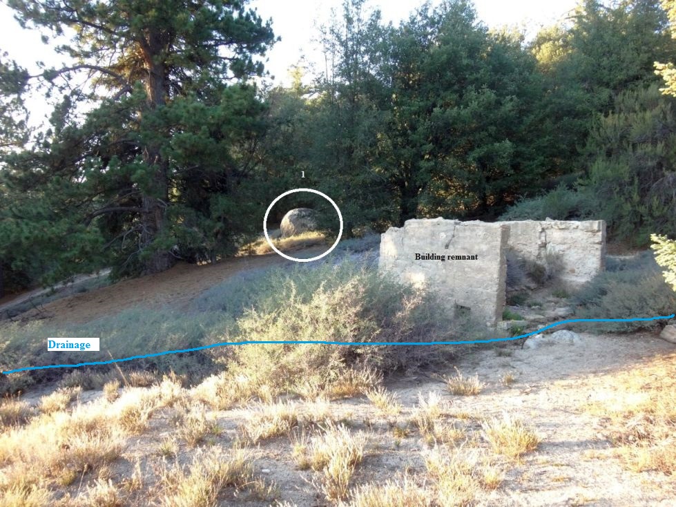 - The Building remnant, with boulder #1 to its northwest, and the drainage on its south:
