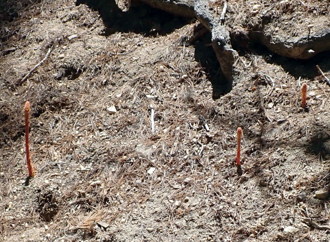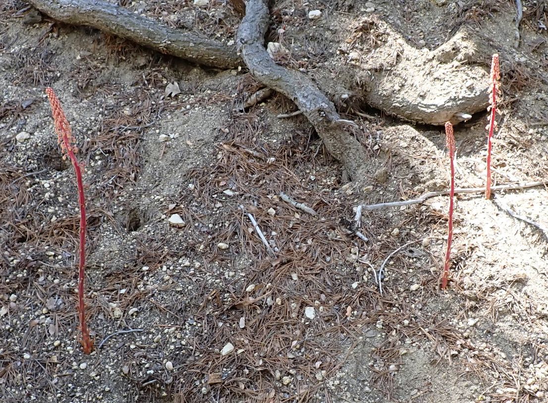 Pinedrops is one of the later bloomers at San Jacinto Mountain, with plants emerging from the ground in July, and blooming in late July and August. The dead stalks persist for at least a year, and perhaps for multiple years.