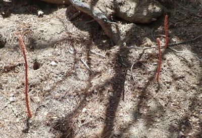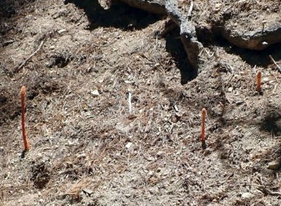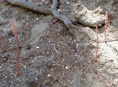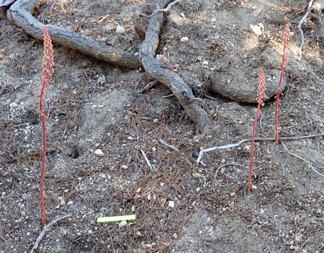 Although it is said to be a perennial in the Jepson Manual treatment, pinedrops acts very oddly for a perennial, since it has a peculiar habit of popping up in different places in some years. Dave reported that he would never know where it would appear in his Pine Cove yard each year; only rarely would new stalks appear in the same place where there had been old stalks. Most of the time when we see fresh stalks at San Jacinto Mountain, there are no old stalks in the same area. But sometimes there are! It was called an annual in the original publication, and "annual or perennial" in the 1959 monograph by Bakshi.