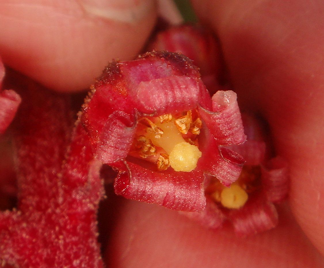 Most people are very surprised to learn that pinedrops are in the heath family, Ericaceae, along with rhododendrons and manzanitas! This isn't some recent result of molecular work; this grouping was recognized in the 1800s, and so far has been confirmed by molecular work. The flowers of pinedrops are very similar to the flowers of manzanitas in shape, so at least those two members of the family have that in common.