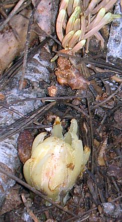 Introduction Pterospora andromedea, pinedrops or pine drops, is a lovely tall mycotrophic ("fungus feeding") plant that has no leaves and no chlorophyll, only flowers that have small bracts. It has no ability to make food on its own, and takes all of its nutrition from the fungus on which it is a parasite. The flowers of pinedrops, and its close relatives, emerge from the ground without leaves and without any green coloring typical of plants. They are sometimes called "fungus flowers", since they can look like the fruiting bodies of fungus when they first emerge from the ground.