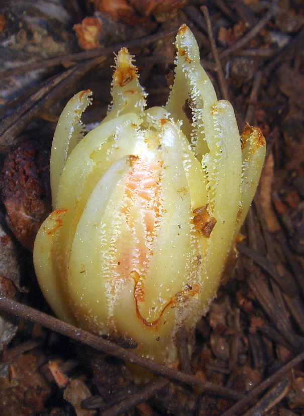 Pinedrops take advantage of the "wood wide web" of ectomycorrhizal fungi that build vast underground networks to gather nutrients. These fungi are in a symbiotic relationship with the trees whose roots they tap into, absorbing carbohydrates and other nutrients from the trees, and in turn supply the trees with water and minerals. However, at least according to our current understanding, mycotrophic plants are parasitic on the fungi, stealing everything they need to grow from the fungi, and giving nothing back to the fungi in return. See What are Mycotrophic Wildflowers? from the U.S. Forest Service for more information.