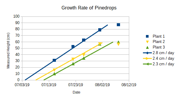 The growth rate of the three plants was 2.8, 2.4 and 2.3 cm per day (1.10, 0.95, and 0.90 inches per day), for plants 1, 2 and 3, respectively. Using the fitted line, the emergence from the ground of the three plants was 4, 8 and 11 July, with the plants reaching their full height on 4 and 2 August for plants 1 and 2. Since the measurement for plant 3 just before its maximum height does not fit the line well, it is a bit unclear exactly when it reached its full height, but it was somewhere between 1 and 6 August.