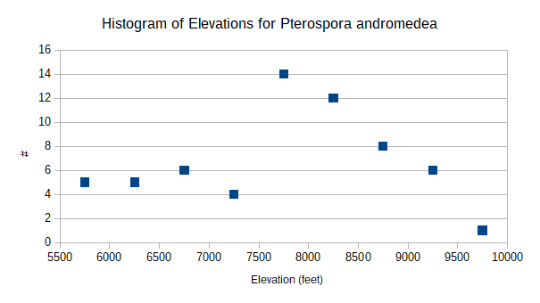 Fig. 4. A histogram of the elevations where we have observed Pterospora andromedea from our digitized surveys as of 11 August 2019.Pinedrops is widespread in North America. It occurs in every state west of the Great Plains, as well as in the northernmost part of eastern North America; see BONAP's North American Plant Atlas geographic map for it. It is also present in Mexico.