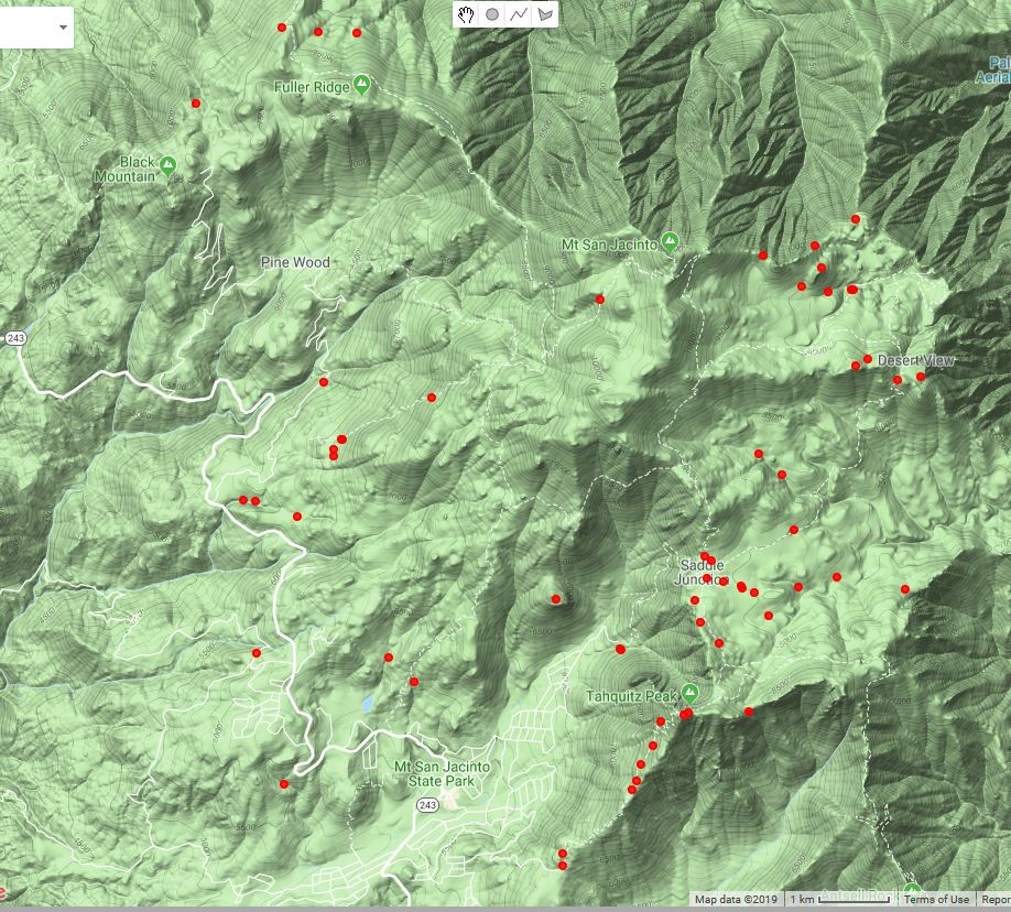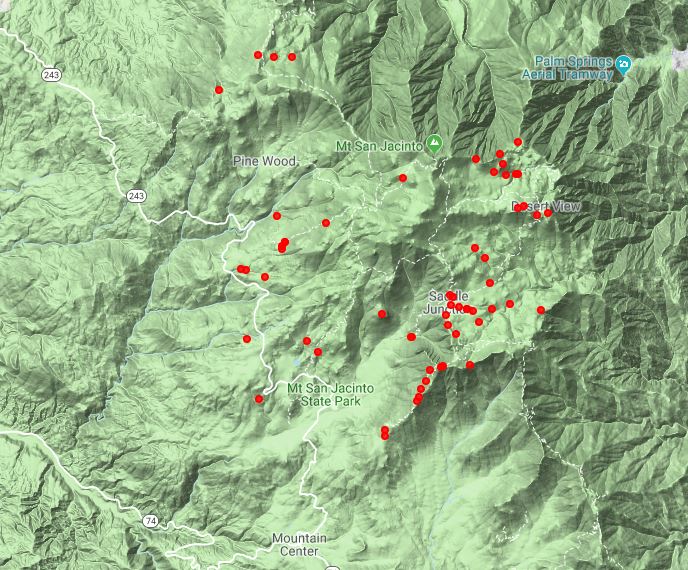 Fig. 3. The 61 locations where we have observed Pterospora andromedea from our digitized surveys as of 11 August 2019. The digitization is complete only above 9000 feet elevation, and becomes progressively more incomplete at lower elevations. Click on the map for a larger version.Fig. 4 shows a histogram of the elevations for our observations of this species. For comparison, Munz 1974 gives the elevation range for this species in southern California as 5000 to 9000 feet, very similar to what we have observed.