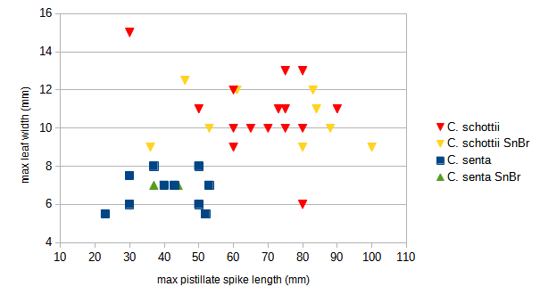 Voucher determinations may be a bit more ambiguous since it is probably rare that the leaf with the maximum width is included in the voucher. The maximum pistillate spike length in a voucher should do a pretty good job for the voucher determination, since that measurement alone discriminates 13 of the 17 schottii from senta.