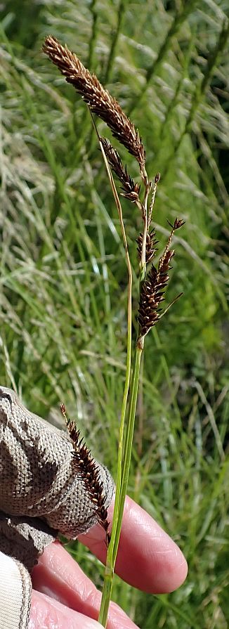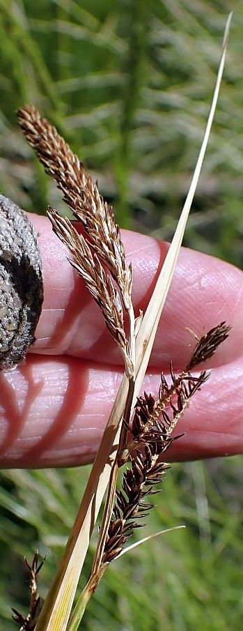 This page was stimulated by Keir Morse, who observed plants in the San Bernardino Mountains that keyed to Carex schottii using the Jepson eFlora key. Those plants formed large clumps similar to those of our C. senta plants in the San Jacinto Mountains. The Jepson eFlora key distinguishes those two species by C. schottii being "cespitose", and C. senta being rhizomed. The obvious inference from this key is that C. senta shouldn't form big clumps. But it does!