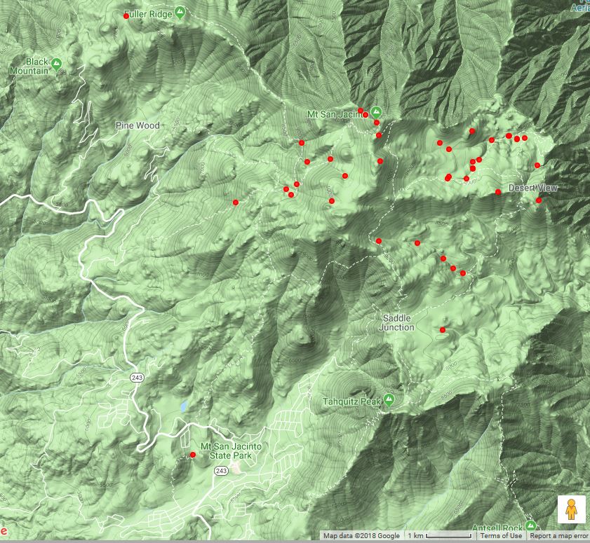 This species seems to be everywhere there is a rock in the water in the San Jacintos and sometimes even without the rock or the water.Fig. 1 shows the geographic distribution of locations of this species from our surveys, which bears out this summary. Many of the locations are clearly seen to be in drainages that at least seasonally have flowing water, with a smaller number of locations at higher elevation growing in cracks in boulders.