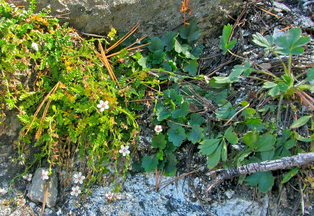 Fig. 1. Two SnJt endemic species and one SnJt near-endemic species growing side by side near the head of Andreas Canyon at the edge of Tahquitz Valley. Left: Tahquitz Ivesia, Ivesia callida, the only one in bloom in this pix. Middle: shaggy-haired alumroot, Heuchera hirsutissima. Right: cliff cinquefoil, Potentilla rimicola. Photo by James Dillane.