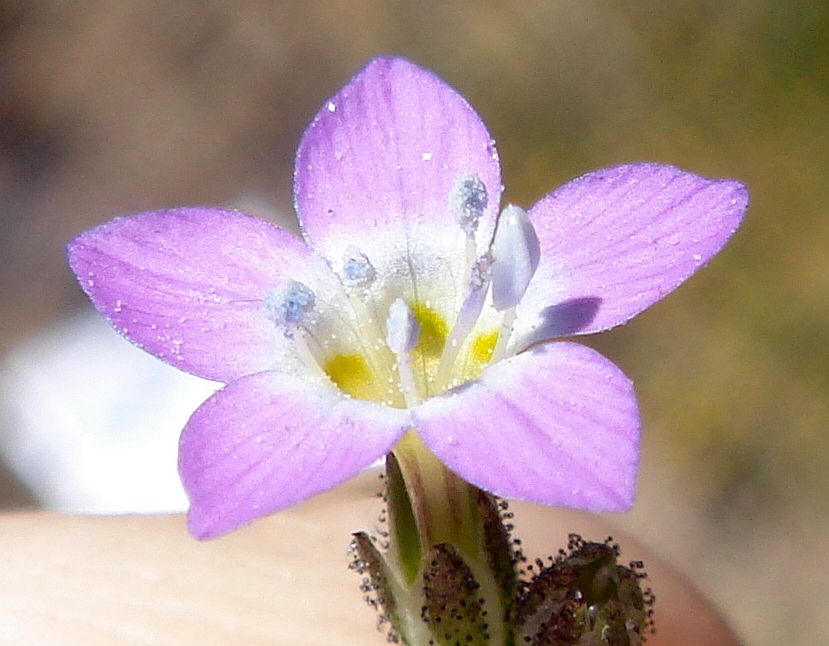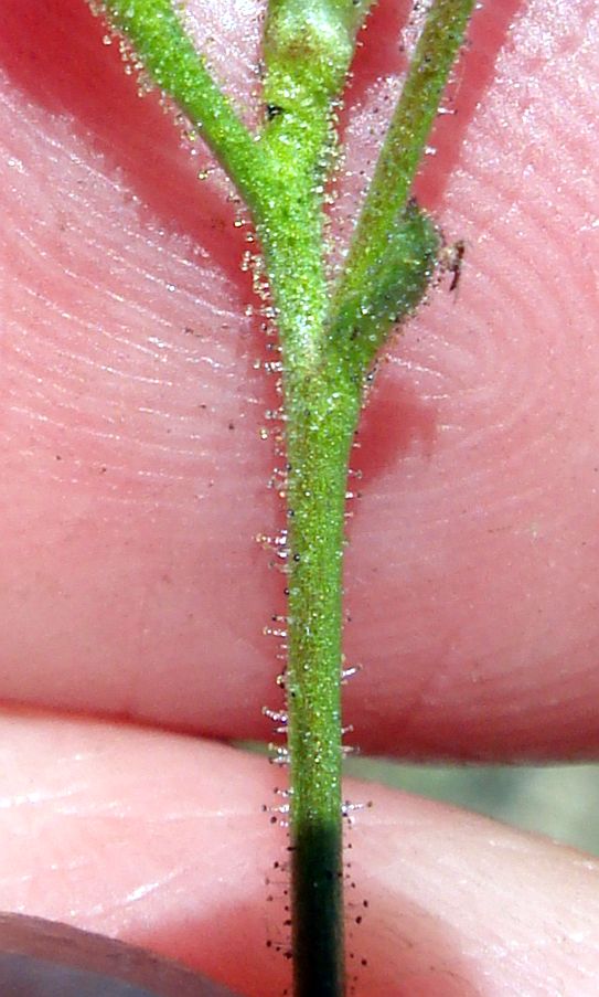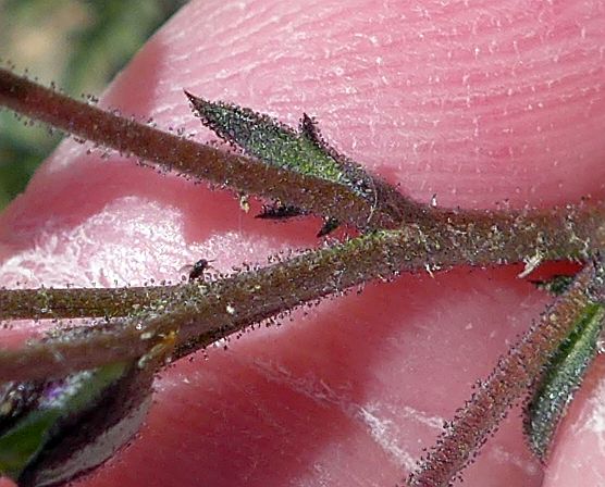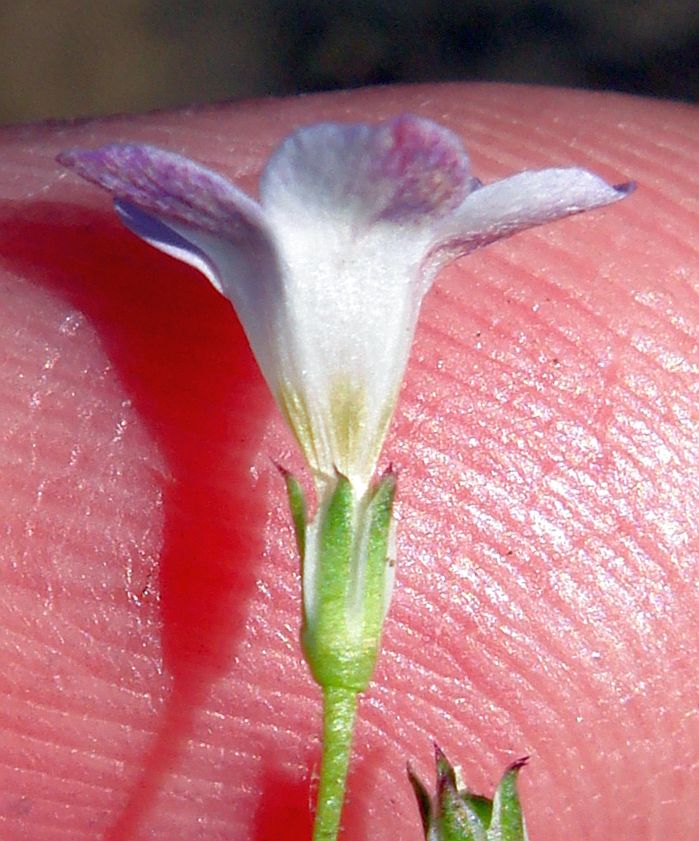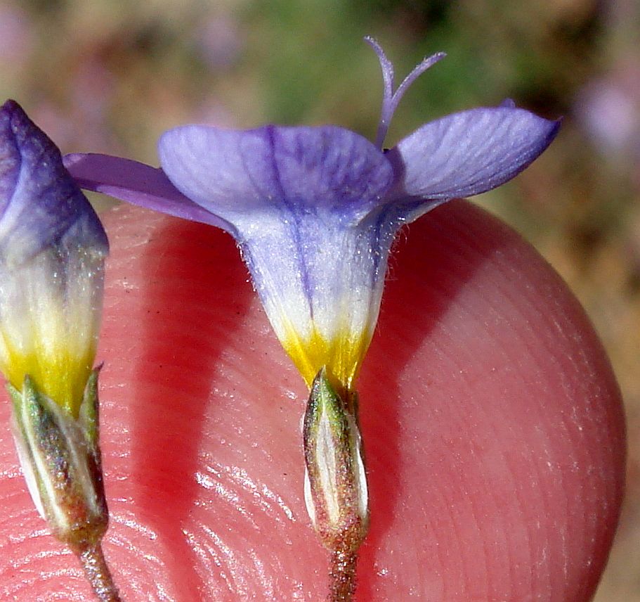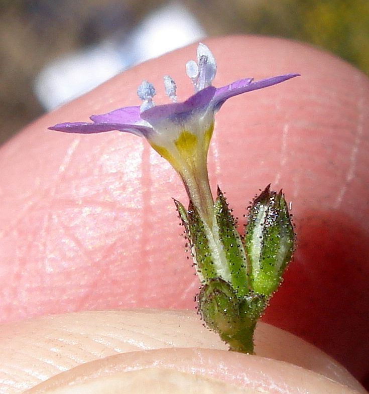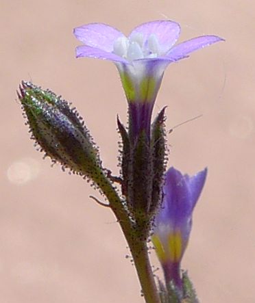 The Saltugilia species are easy to recognize, since they have translucent hairs on the leaves which can often by spotted sparkling in the sun from a standing position, and they have tack-shaped glands on the pedicels and stems just below the flowers. Tack-shaped glands are shaped like a tack, with a large flat head as wide as the stalk as long. Most other glands have a stalk longer than the width of the head, or have heads that are spherical, not flat.