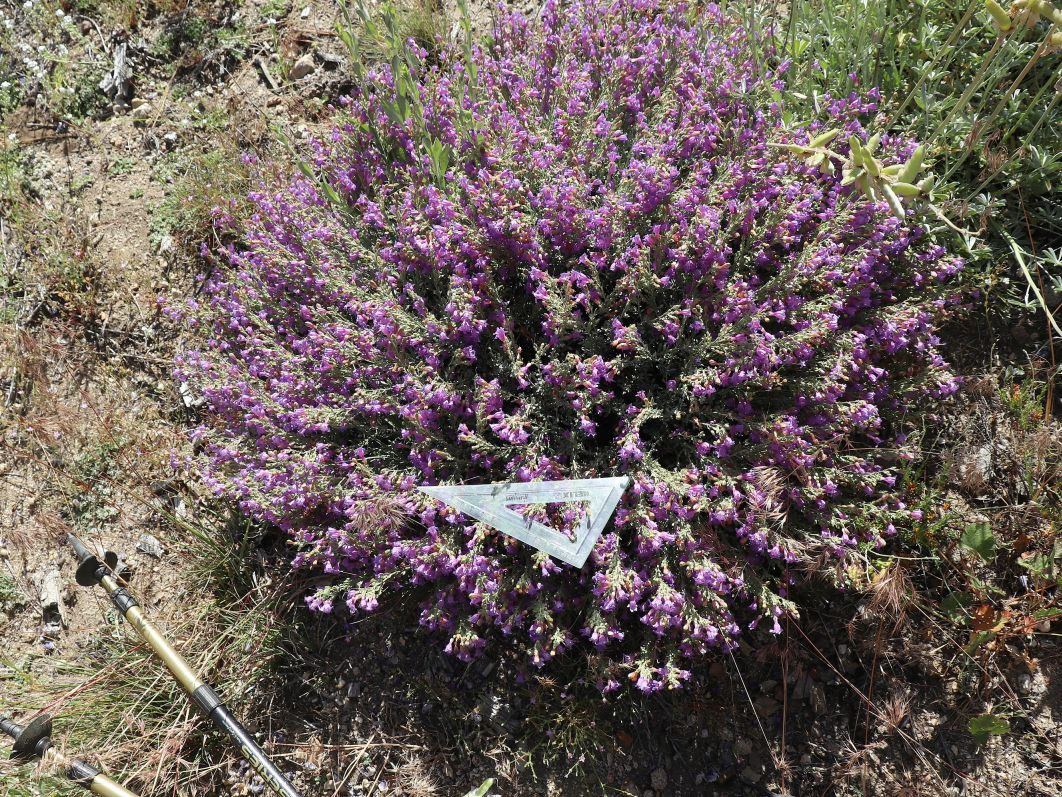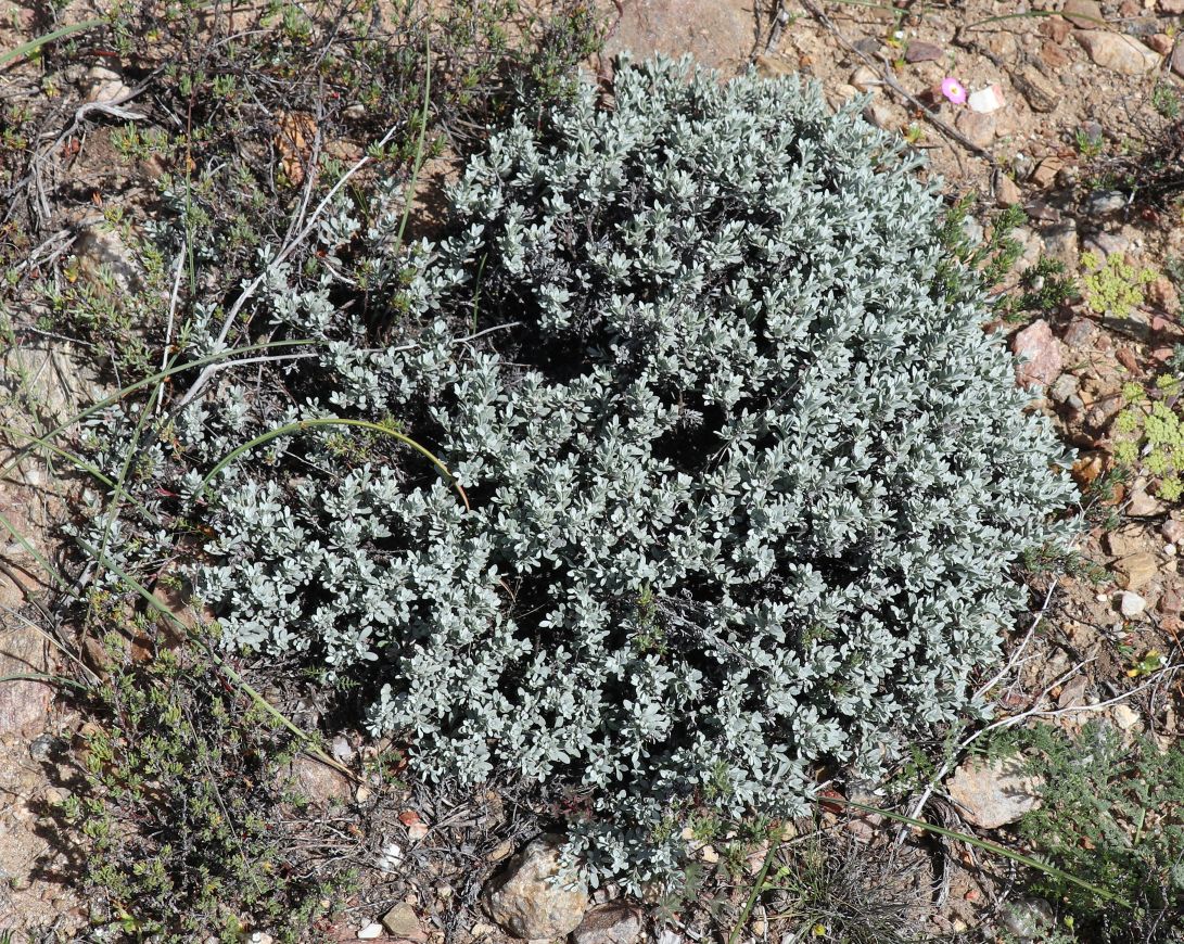 Ecology P. californicus is a low mounded subshrub that grows in dry rocky areas. Typical plants are ~10 cm (4 inches) in height, and 10 to 30 cm (4 to 12 inches) in diameter (need to check values). The flowers are individually fairly small, ~16 mm (0.6 inches) in length, but there can be hundreds of flowers open at once on a single plant, making a showy display. The largest most-floriferous plant seen by Bruce Watts had at least 1,400 flowers open at once; the longest side of the triangular ruler in the linked picture is seven inches.