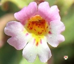 Fig. 2. Left: M. androsaceus. Right: M. rubellus. Click on the pictures for larger versions. Photographs © Bruce Watts. The lower part of the corolla throat of M. androsaceus has yellow somewhat-meandering streaks interfingered with reddish blotchy streaks. In the field, with a hand lens, the yellow meandering streaks are fairly easy to pick up. In contrast, the lower part of the corolla throat of M. rubellus is mostly yellow, with small oval pink-reddish spots inside the throat, and larger pinkish linear streaks at the base of the corolla lobes.